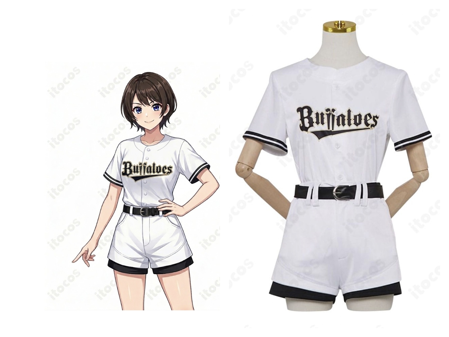 白銀ノエルのやさしさと頼もしさを、スポーティーに楽しめるオリックス・バファローズ コラボ衣装。配信やライブで見せる明るさはもちろん、団長らしい存在感まで自然に表現しやすいデザインです。厚みのあるコスプレ専用生地を使っているので、発色がきれいで形も整いやすく、写真にしたときの見映えもすっきり。コミケや撮影会、スタジオ撮影、球場コーデ、TikTokやYouTubeの動画撮影にも合わせやすい一着です。夏の屋外では吸汗インナーを合わせると、より快適に着用しやすくなります。