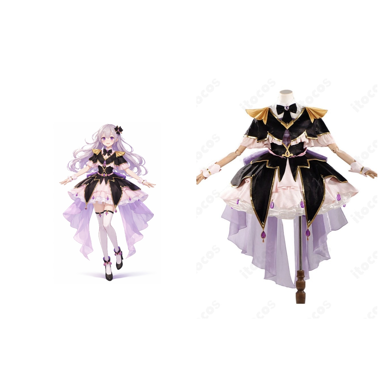 森亜るるかの落ち着いた知性と、キュアアルカナ・シャドウ変身後のミステリアスな華やかさを、衣装でしっかり楽しみたい方にぴったりの一着です。影を思わせるシックな空気感の中に、プリキュアらしい可愛さもきちんと残っていて、撮るたびに雰囲気が出やすいのが魅力。ケープや蝶ネクタイ、背部蝶結び、チェーン装飾が重なり、ステージ映えも写真映えも狙いやすい仕上がりです。