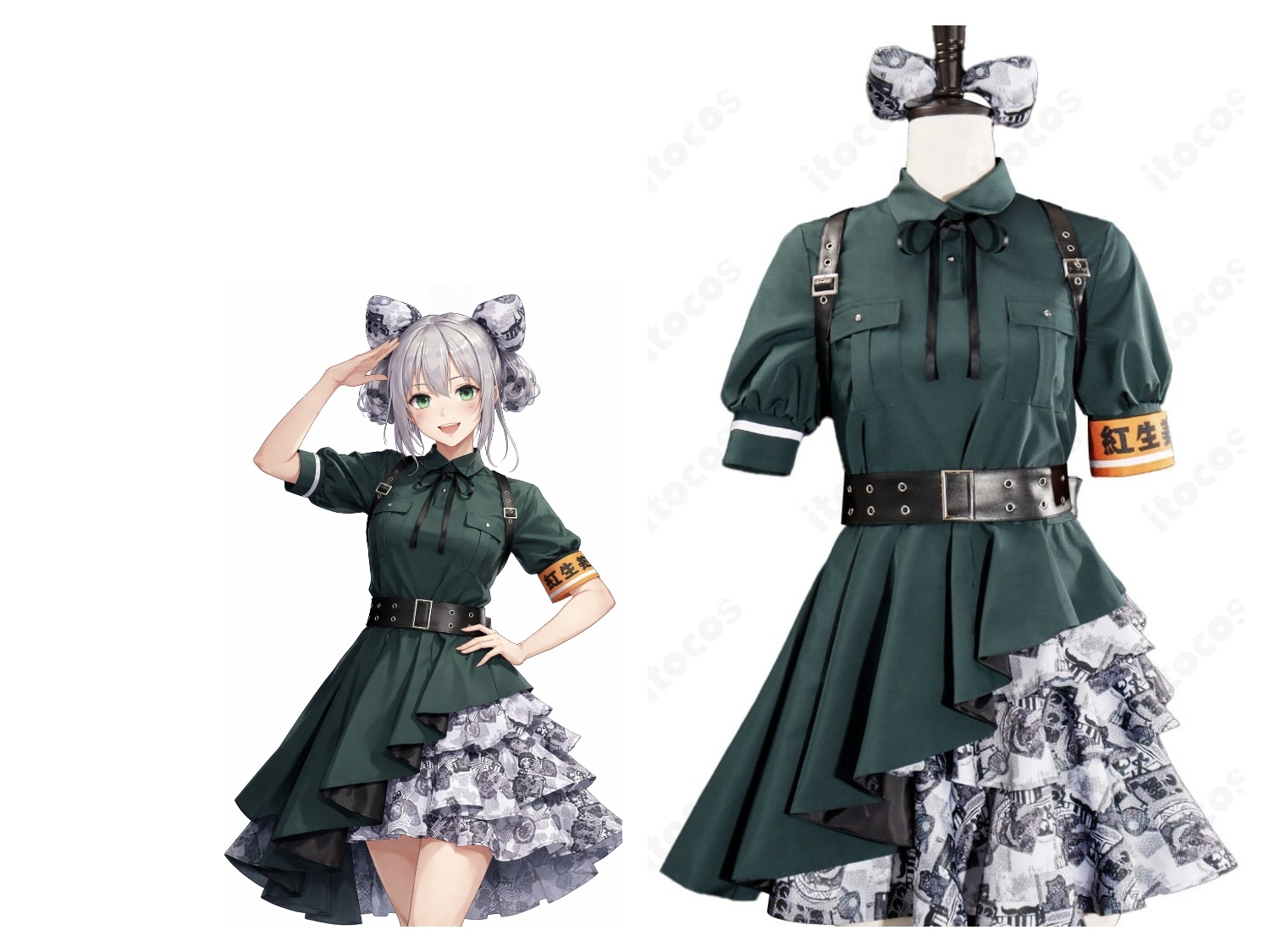 セット内容は、トップス、スカート、ベルト、リボン、腕章、カチューシャ、胸ベルト、手首飾り。軽快さ重視のため、寒い時期の屋外ではインナーやタイツの併用がおすすめ。サイズはXS〜Lに加え、オーダーメイドにも対応しています。
